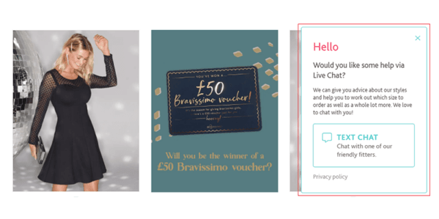 A UK-based lingerie vendor Bravissimo integrated a live chat on their website (as shown below) to help their clients receive prompt responses on product-related questions, and found that it has decreased their abandonment rate to around 6.08%.