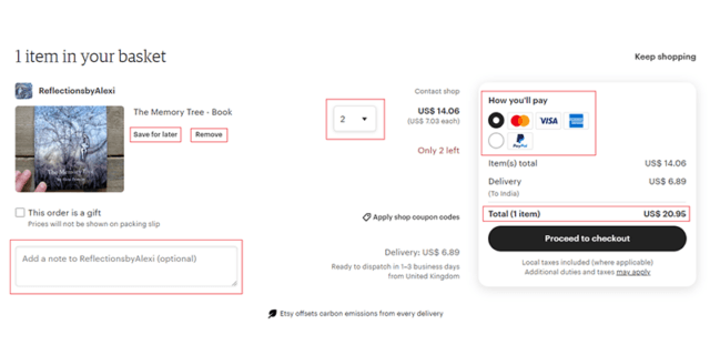While designing the cart for your website, rather than just making it to display the number of items, also try to show all key details such as shipping charges, shipping type, tax, and delivery fee. Besides, try to include a possibility to remove an item, change the number of the item that is added to cart, add notes to it, and save the item for future use.